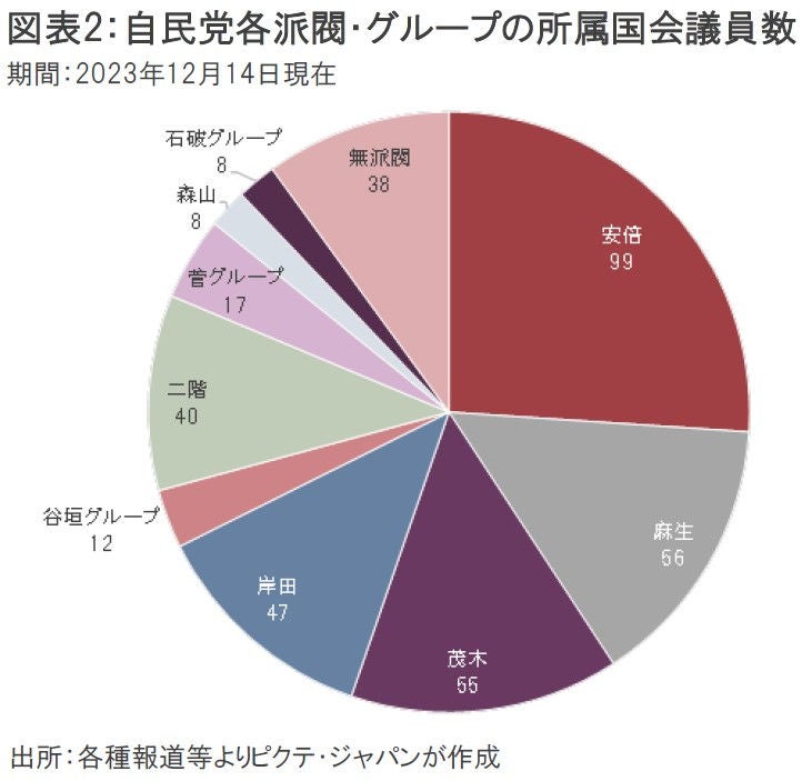 特に自民党国会議員の99名が所属する最大派閥の安倍派への疑惑が深まったことで、岸田政権全体を揺さぶる事態に至った(図表2)。同派は岸田首相を支える主流派の中核であり、松野博一官房長官、西村康稔経産相など4閣僚、自民党では萩生田光一政調会長、高木毅国対委員長など重要ポストへ人材を送り出してきたからである。