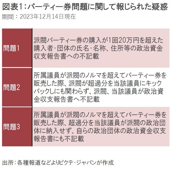 しかしながら、11月29日、神戸学院大の上脇博之教授がこの件を刑事告発、東京地検が受理して特捜部による捜査に至り、重大な事案である可能性が台頭した。仮にノルマ超過分を派閥、議員ともに報告書に記載しなかった場合、もしくはノルマ超過分が議員の事務所に残り、議員側が報告書に記載していなかった場合・・・いずれも事実なら裏金と言われても止むを得ない(図表1)。