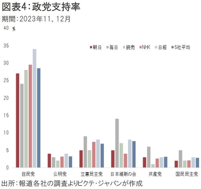 一方、12月11日、NHKが発表した最新の世論調査では、岸田内閣の支持率が前月に比べ6%ポイント低下の23%、自民党の支持率は同8.2%ポイント低下の29.5%だった。もっとも、野党第一党の立憲民主党の支持率は7.4%に止まるため、自民党との間には20%ポイント以上の差が存在する。さらに、大手メディア5社の調査の平均でも、自民党は30.1%であり、立憲民主党の6.3%、日本維新の会の7.6%を大きく上回った状態だ。