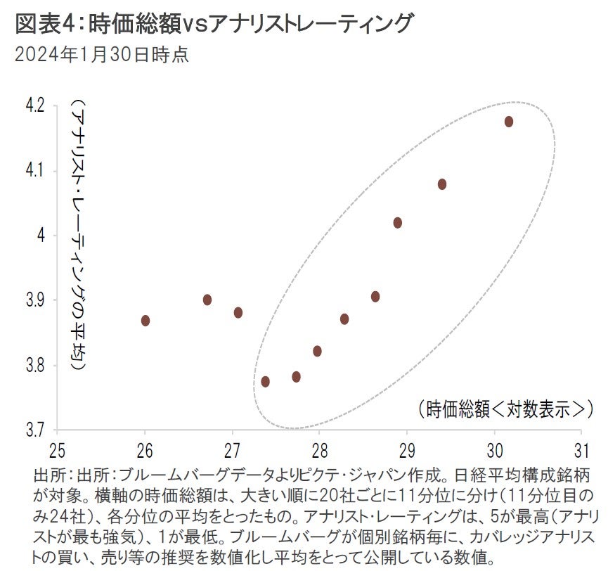 第二に、アナリスト・レーティングと時価総額との相関の高さである。日経平均構成銘柄を、時価総額が大きい順に20社ごと仕切り、その平均レーティングを取ると、小規模企業を除き、時価総額が大きい銘柄ほどアナリスト・レーティングが高いことがわかる(図表4)。企業規模と増益率にも同様の関係があるならわかるが、そのような相関は見られない。