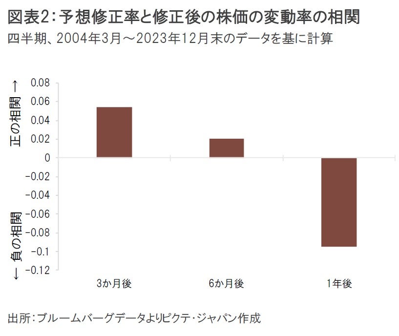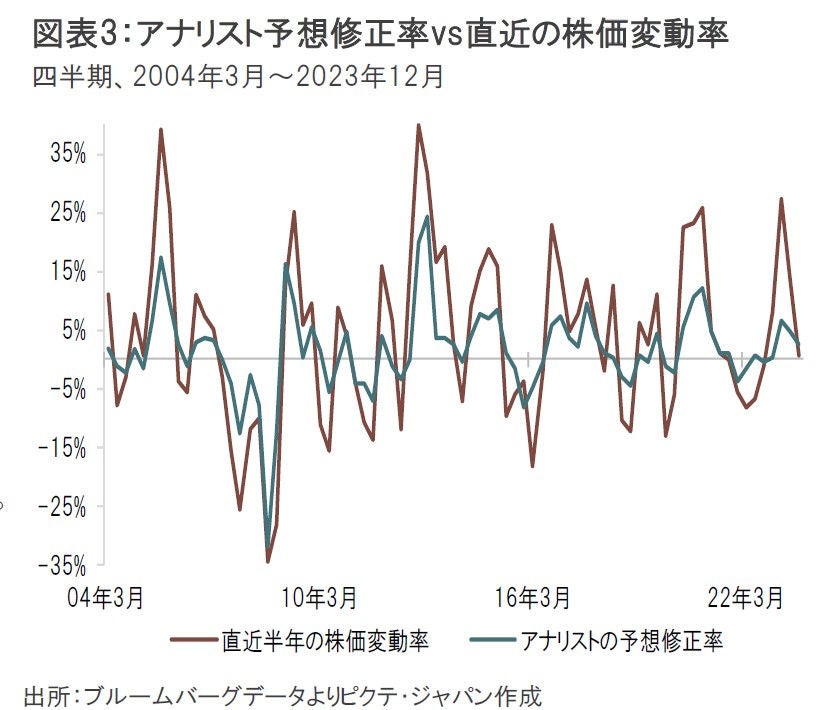 なぜアナリスト予想は当たりにくいのか。第一に、アナリスト予想が足元のトレンドに引きずられ過ぎてしまっている可能性がある。アナリスト予想の修正率と修正時点までの半年間の株価変動率の相関は極めて高く(図表3)、予想修正の74%は足元の株価のトレンドで説明できる。極端なトレンドフォローのように見える。