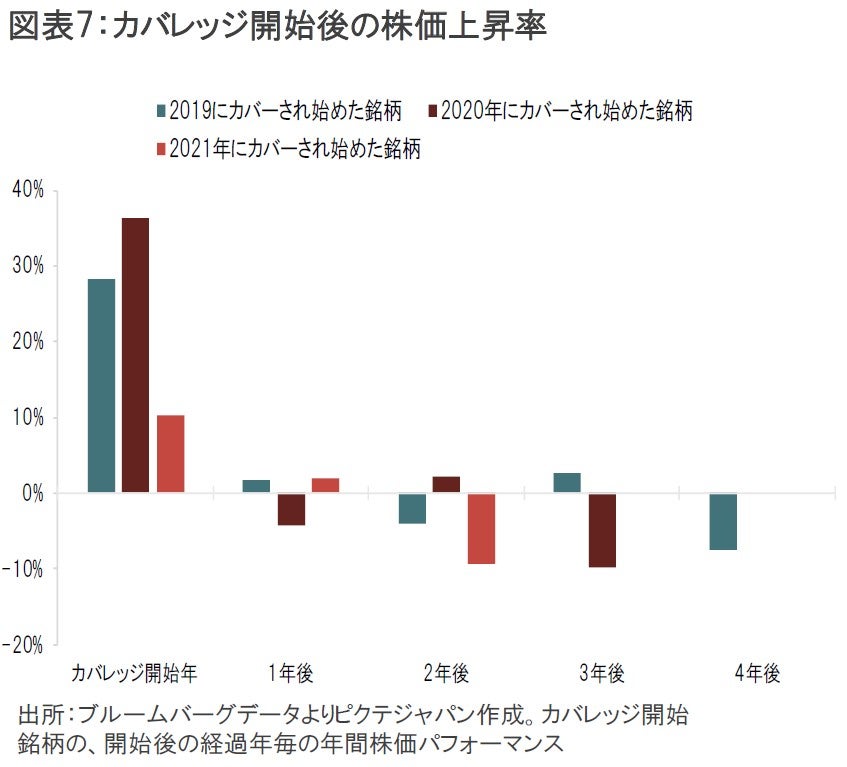 もっとも、これらのカバレッジ開始銘柄の株価上昇率の“賞味期限”は短い。2019年から2021年までにアナリストがカバーし始めた銘柄がTOPIX総合指数を大きく上回れるのはカバレッジ開始年のみである(図表7)。それ以降は殆どTOPIXを上回れないか、大きくアンダーパフォームしている。