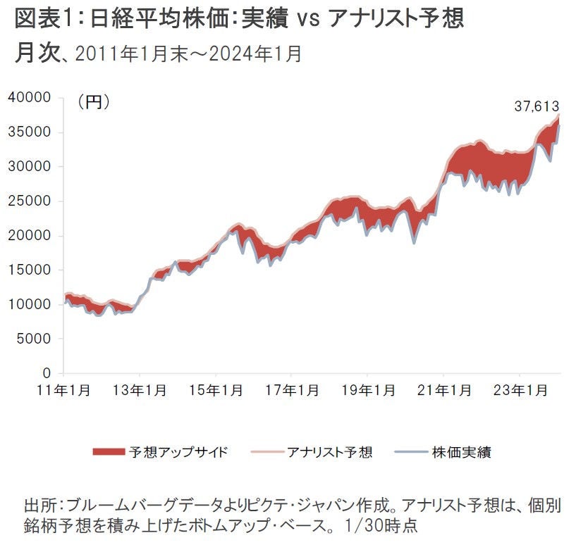 新NISAの開始とともに、日本株の上昇が著しい。この結果、アナリストが予想する12か月後の日経平均株価は、既にほぼ達成し、現値との乖離(アップサイド)は4%程度まで縮小してしまった(図表1。1/30時点)。近年はアナリスト予想のアップサイドが大きくなっており、特に年初は強気予想が目立つ傾向にあったが、今年は年初の株価上昇に予想が追い付いていない。現在のアップサイドの低さは、アベノミクス相場の2013年1月以来である。