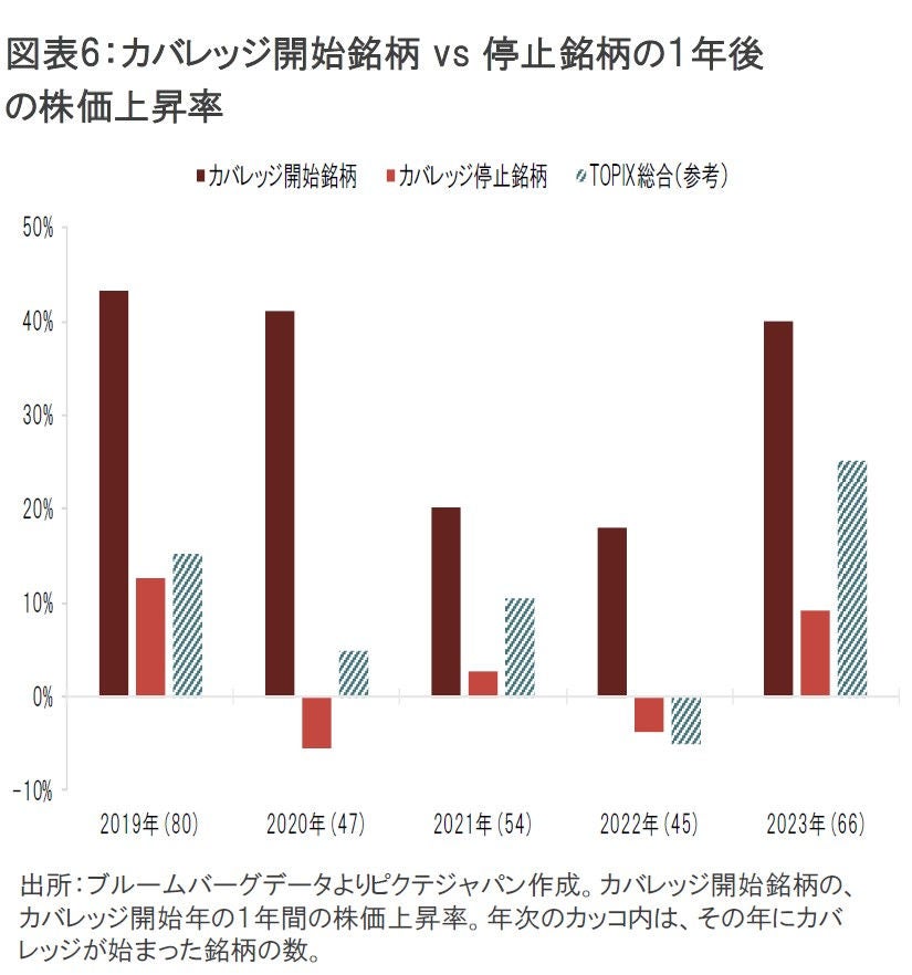 特に注目すべきは、新規カバレッジ銘柄の株価上昇率である。アナリストがカバレッジを開始した銘柄は、カバレッジが停止されてしまった銘柄に比べて圧倒的に高い上昇率を示す(図表6)。2019年から2023年の間にカバレッジを開始した銘柄の該当年内の上昇率は平均で33%だったのに対し、カバレッジが停止された銘柄の上昇率はわずか3%だった。カバレッジ開始時は8割近くが買い推奨であり、「『買い』でカバレッジを開始した」とアナウンスされるため、特に注目を集めやすいとみられる。カバレッジが開始された銘柄を買い、停止された銘柄を売れば、鞘が取れる可能性が相応に高いだろう。