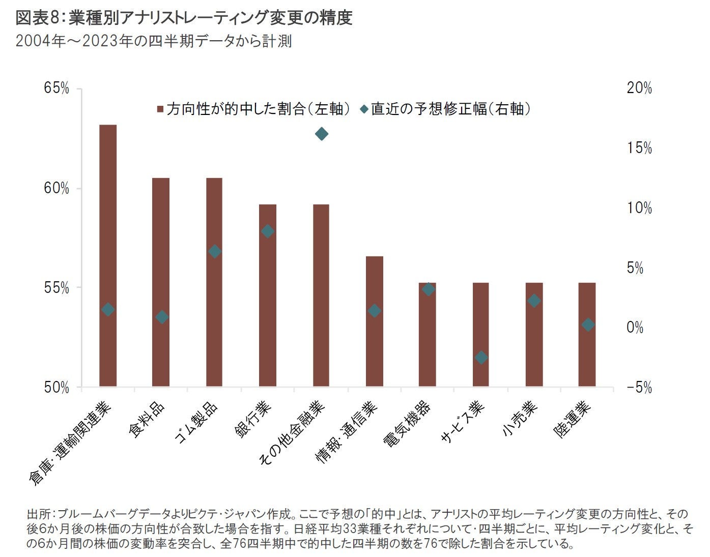 また、業種別に的中率の違いにも注目したい。図表8は、業種別の平均アナリスト・レーティングの変更とその後の株価の変動の方向性との相関をとったものだ。例えば、倉庫・運輸関連業のアナリストのうち何人かの推奨レーティングが「売り」に転じ、平均レーティングが下がった後、6か月後の株価が下落したら的中したと定義する。