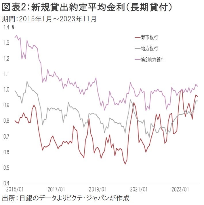 背景には、銀行にとっての利鞘の改善があるだろう。商業銀行の場合、基本的な収益の源泉は、短期金利に連動する預金を集め、それを長期金利に連動する貸付に活用して利鞘を稼ぐことにほかならない。足下、日銀がイールドカーブ・コントロールを段階的に修正、10年国債の利回りが上がったことにより、新規長期貸出の約定平均金利は緩やかに上昇してきた(図表2)。金融政策が出口戦略に向かうとすれば、更に長短スプレッドが拡大する結果、利鞘の改善により銀行の貸出意欲はさらに刺激されるだろう。