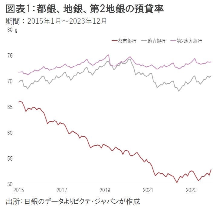 日銀によれば、昨年12月、都市銀行の預貸率は52.77%、地方銀行71.02%、第2地方銀行73.74%だった(図表1)。2022年5、6月を底として、いずれも緩やかな上昇基調にある。デフレ期において、資金需要が極めて弱かったことから、日本の銀行の預貸率は長期的に低下傾向をたどった。預貸率の上昇は資金需要の増加を示しており、経済の拡大を裏付ける指標と言える。