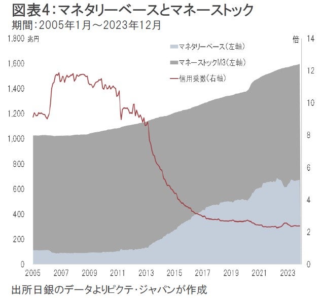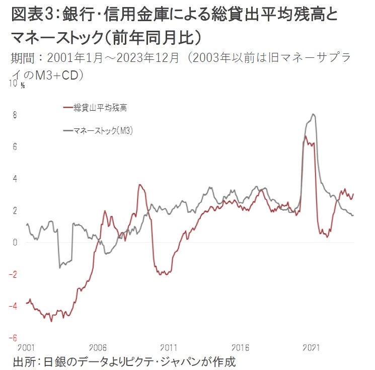 2つ目の課題は、仮に融資先の発掘がマクロ的に奏功して貸出が伸びた場合、実は金融政策の方向と逆行するリスクだ。経済全体の通貨供給量を示すマネーストックは、基本的に銀行の貸出残高とトレンドが一致する(図表3)。つまり、出口戦略の下で長短金利のスプレッドが拡大、銀行の融資が増加すると、マネーストックも伸びるだろう。