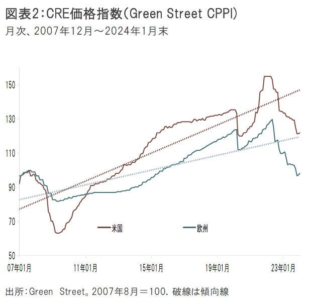 欧米のCREの価格は、2022年春以降下落を続けている(図表2)。直近ではやや下げ止まりつつあるようにも見えるが、依然として前年同月比では米国で9.1%、欧州で10.9%下落しており、トレンド線からの乖離率はリーマンショックに次ぐレベルとなっている。
