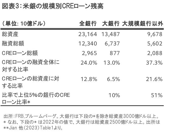 現在の米国のCREローンの規模を確認しておきたい。2023年末時点で、米銀の平均で、総資産の12.8%、融資全体に対して24.0%に上る(図表3)。
