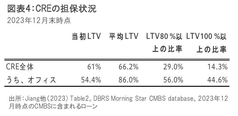 CREには、集合住宅、オフィス、ホテル、商業施設、工場施設などがあるが、特に問題になっているのが金利上昇とコロナによる需要減の影響を受けているオフィスである。オフィス向けCREローンのLTV(融資額÷担保価値)は相対的に高く、2023年末時点で44.6%が100%超、即ち“担保割れ”になっているというデータもある(図表4)。
