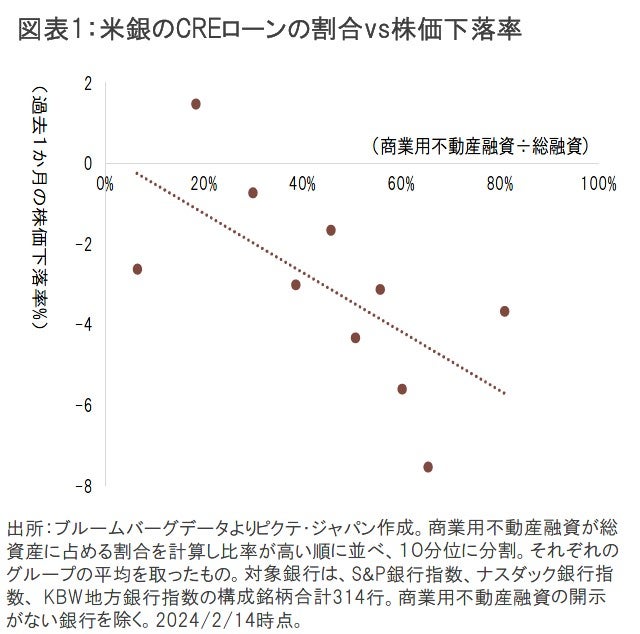 ニューヨーク・コミュニティ・バンク(NYCB)の2023年10‐12月期決算は市場にサプライズを与え、米銀株の押し下げ要因になっている(過去1か月の株価とCREローンの相関を図表1に記載)。NYCBは、商業用不動産(Commercial Real Estate, 以下CRE)の価格下落で引当金が急増、赤字決算となった。また、資本規制のカテゴリーが「地方銀行」区分から、「カテゴリーIV」に引き上げられ、資本規制が厳格化されることとなった(違いは、例えば、ストレステストが課される、レバレッジ比率などの算出も求められる等)。昨年破綻したシグネチャー銀行を買収したことで、バランスシートが急拡大したためだ。