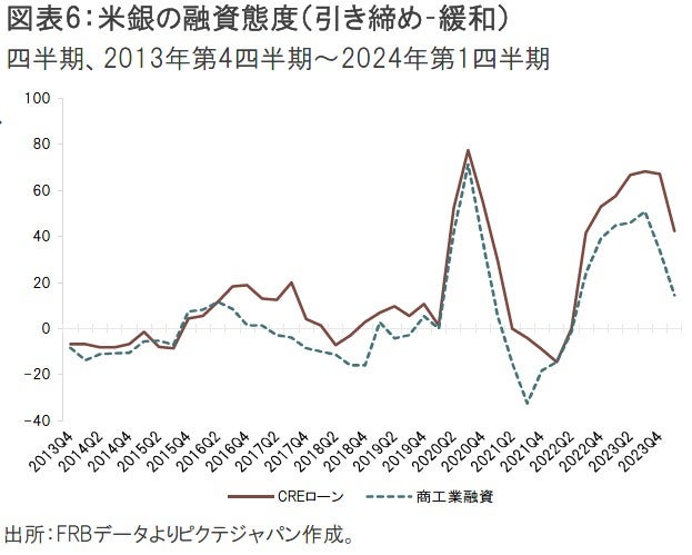 第一に銀行の融資態度の厳格化である。図表6の通り、足元では、若干持ち直してきたようにも見えるが、 CREローンに対する融資態度は、一般の企業等向け融資に対する態度に比べると改善が鈍い。今回のNYCBの件も、銀行のCRE向け融資態度にマイナス影響を与える可能性があるだろう。