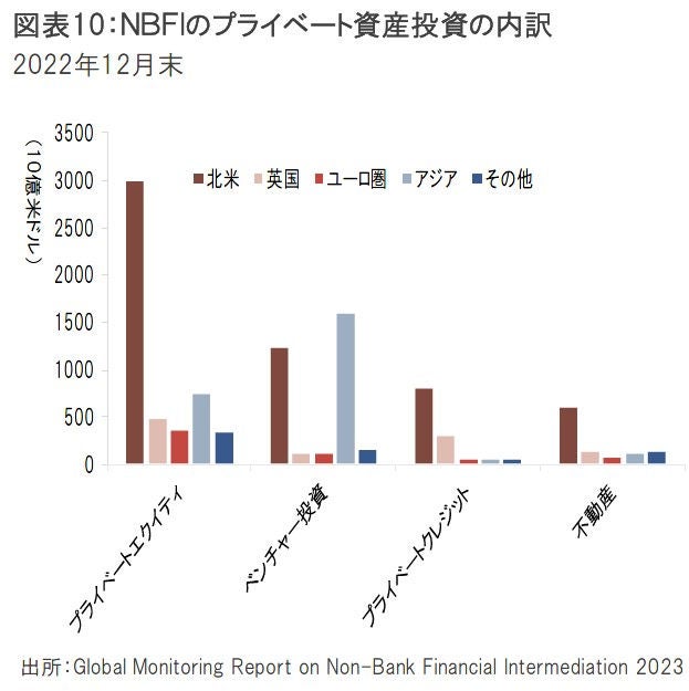 最後に残されたリスク分野は、ノンバンク金融仲介業(以下NBFI)によるCREローンである。昨年1年間でブラックストーンの基幹REITであるBREITから130億ドルが流出したとも伝えられている。銀行業界ほどの情報がないことが不安を増幅させる。しかし、少なくとも直接投資額は他の資産に比べて小さいとみられ(プライベート投資の資産クラスを図表10に掲載)、かつ、金融当局は徐々に監督を強化しつつあることから、今のところ、管理不能となるような懸念材料であるとは考えにくい。