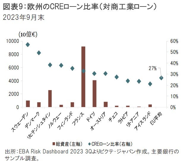 米国以外で懸念されるのは欧州の銀行への影響である。前掲図表2の通り、欧州の方が商業用不動産価格の下落率は大きい。