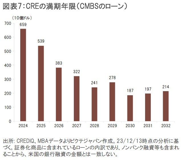 また、今年と来年に満期を迎えるローンの金額が巨額に上る点も懸念材料である。図表7は、CMBS(商業用不動産融資の証券化商品)に含まれているローンの満期日の内訳である。これによれば、今年と来年に満期が到来するローンの割合は全体の3割超、1.2兆ドルに上る。