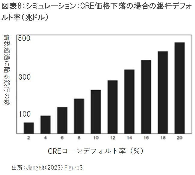 その場合、米銀にはどの程度の打撃となるのか。Jiangらの分析によれば**、仮にCREのデフォルト率が2%程度まで上昇した場合、債務超過に陥る米銀の数は約50行に上る。更に5%まで上昇した場合、債務超過に陥る米銀は120行前後まで増加しうる(図表8)。