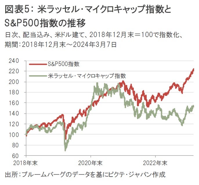 また、米国の超小型株市場が低迷した影響も大きい。2024年3月7日時点の米ラッセル・マイクロキャップ(超小型株)指数は、最高値をつけた2021年3月12日から配当込みで約22%下落した状態にあり、S&P500指数と比較したパフォーマンス格差が顕著となっている(図表5)。