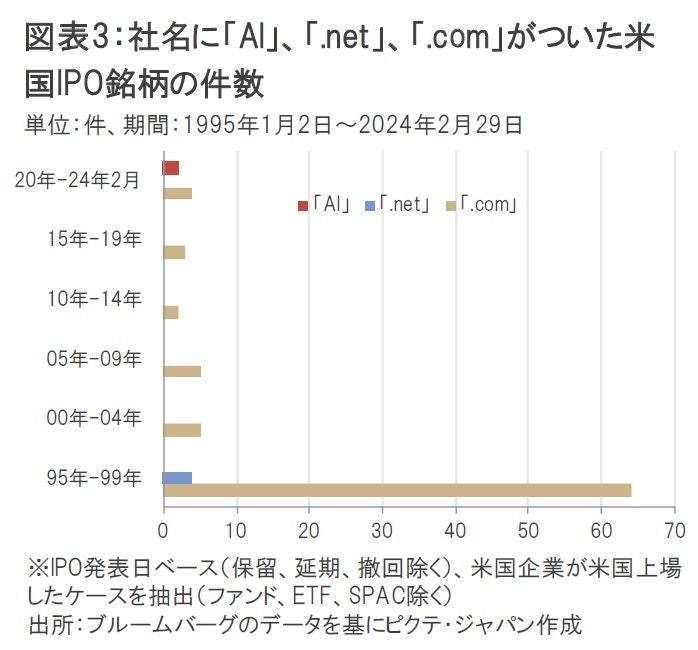 特徴的なのは当時のIPO銘柄の社名だ。1990年代後半(特に1999年)には社名に「.com(ドットコム)」を冠した企業が相次いで上場し、文字通り「ドットコム・バブル」となった(図表3)。