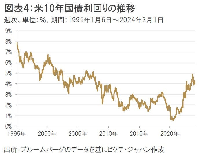 1990年代後半の米10年国債利回りは年々低下傾向にあったが、2022年以降は反対に上昇傾向となっており、市場環境は大きく変化した(図表4)。