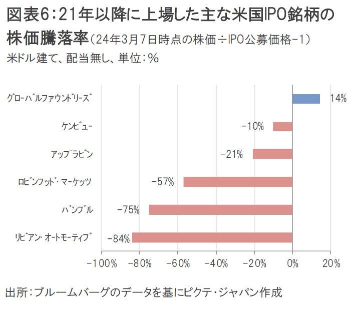 さらに、2021年以降に上場した主要銘柄の直近の株価がIPOした当時の公募価格を下回っていることもマイナス材料だ(図表6)。