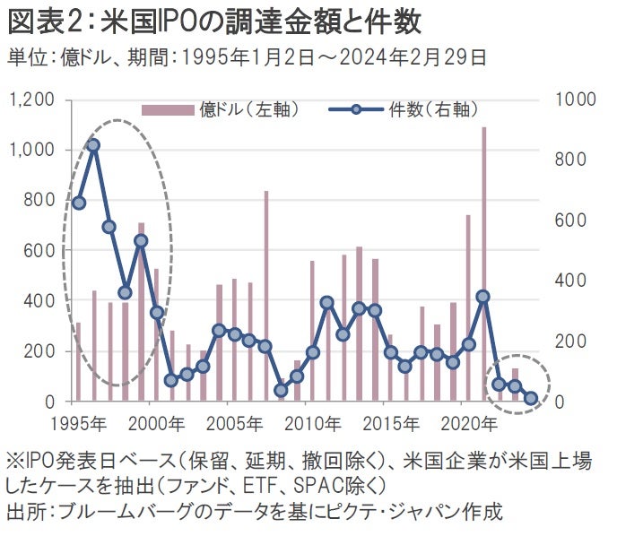米国のIPO市場においてバブル的な状況が発生していないことはポジティブだが、そもそも米国のIPO市場がここ数年来停滞していることも問題だ。 2022年から米国のIPO市場が停滞した要因としては、①米国の長期金利上昇、②米国の超小型株市場の低迷、③主要IPO銘柄の急落、などが挙げられる。