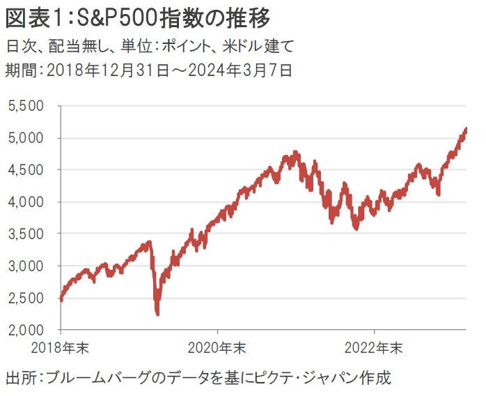 米国株式市場の代表的な株価指数であるS&P500指数は急ピッチな上昇が続く(図表1)。同指数の市場予想PER(株価収益率、12カ月先)は足元で20倍台であり、バブルが指摘されるほどの水準では必ずしもない。しかし、生成AI(人工知能)ブームをきっかけとした半導体関連銘柄の急騰が、一部の市場関係者の間でITバブルを彷彿とさせているようだ。