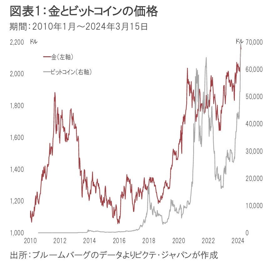 金及びビットコインの価格が史上最高値圏にある(図表1)。これは、既存通貨に対する信認が揺らぎつつあることを意味するのかもしれない。