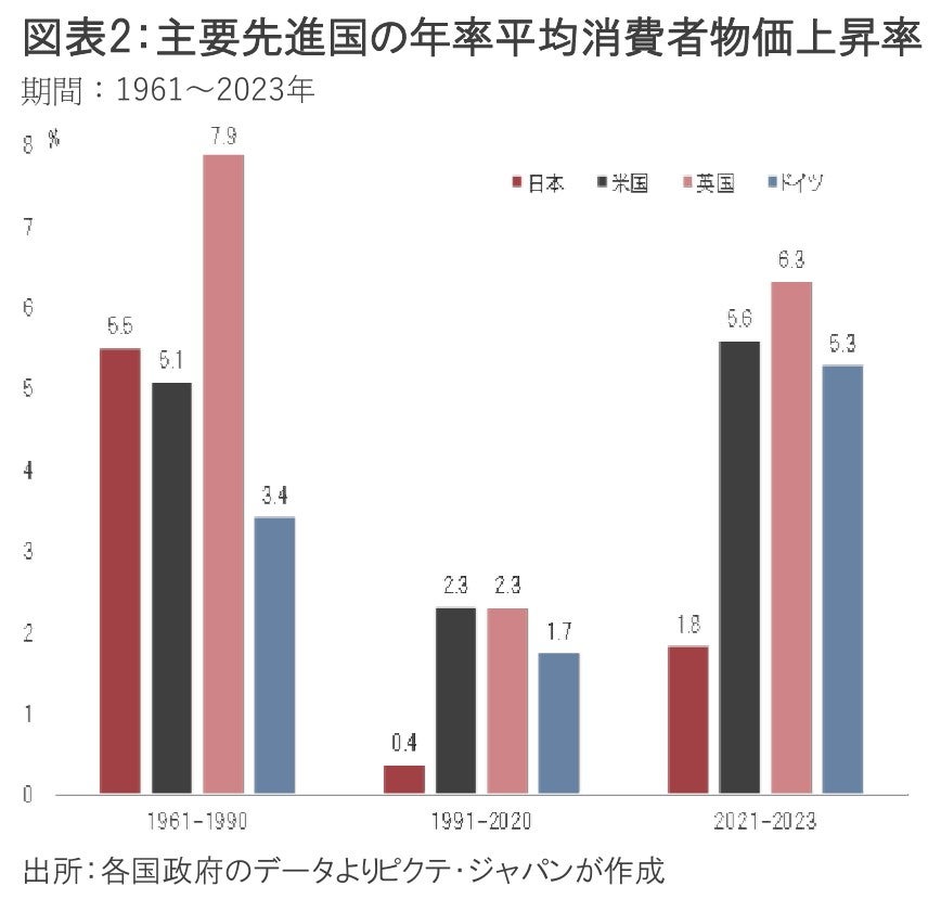 1961~90年と1991~2020年の日本、米国、英国、ドイツにおける年平均の消費者物価上昇率には、いずれの国でも大きな差が生じていた(図表2)。それは、分断の時代か、それともグローバリゼーションの時代か、国際的な政治情勢が経済構造に大きく影響したことが要因と考えられる。金の価格は、それを如実に反映していた。
