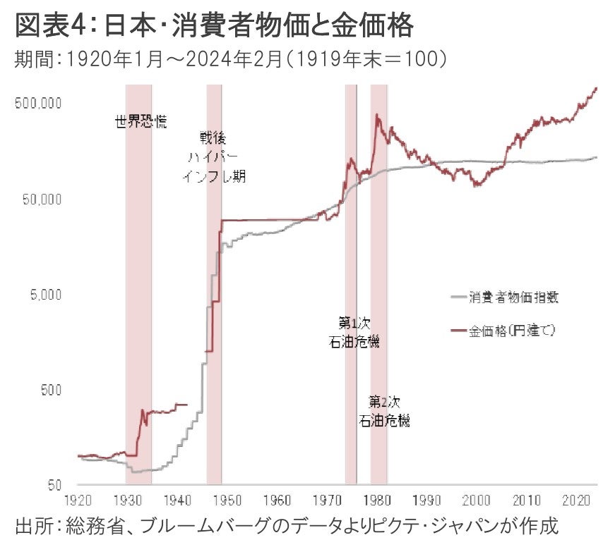 金のインフレヘッジ機能は、日本経済においても如何なく発揮されてきた。第1次、第2次石油危機の時期は米国と同様だが、より特筆されるのは戦後のハイパーインフレの局面に他ならない。戦時公債が紙屑化するなか、金は物価の上昇を完全にカバーしている(図表4)。また、円建ての金価格は、2013年からの日銀による量的・質的緩和の下、長期的に顕著な上昇トレンドに入った。これまでの金価格の推移を振り返えると、市場の先見性が如実に示されていると言えるのではないか。