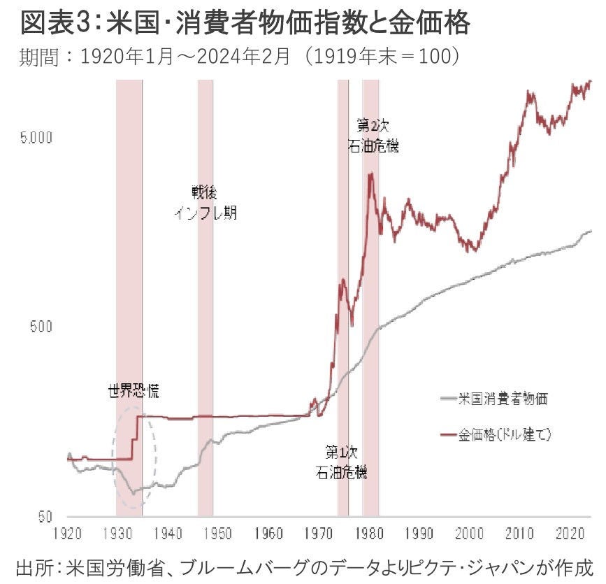 ドルベースでの金の価格の推移を見ると、1971年8月のニクソンショックによりドルが実質的な変動相場制へ移行して以降、金はインフレ率を上回るパフォーマンスを示している(図表3)。特に、第1次、第2次石油危機によるハイパーインフレ期に、金は大幅に上昇してヘッジ機能を果たした。その後、世界的な物価安定の下で金価格も20年以上に亘る調整期に入ったが、リーマンショック辺りから再び顕著な上昇トレンドとなったのは、FRBによる大胆な金融緩和が、将来的にインフレをもたらす可能性を意識した動きと見ることも可能だ。