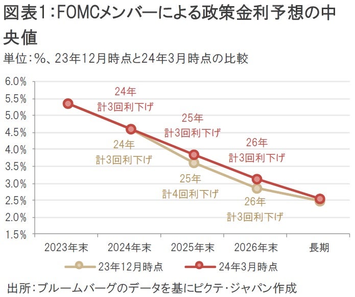 実際、今回発表されたFOMCメンバーの経済見通しでは、24年の米実質GDP成長率の予想が前回(23年12月)の+1.4%から今回+2.1%へ、米コアPCE(エネルギーと食品を除いた個人消費支出物価指数)も前回の+2.4%から今回+2.6%へそれぞれ上方修正された(いずれも10-12月期の前年同期比)。それにもかかわらず、今回のFOMCでは年3回の利下げが引き続き示唆されたことから、FRB(米連邦準備制度理事会)の金融政策はかなり「ハト派(金融緩和に積極的)」と解釈された。