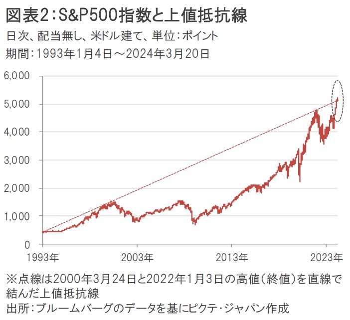 S&P500指数の2000年3月24日と2022年1月3日の終値(高値)を直線で結ぶと超長期の「上値抵抗線」が引ける(図表2)。S&P500指数はちょうどこの「上値抵抗線」を3月20日に明確に超えてきたことから、ここもとの上昇トレンドが今後も継続する蓋然性が高まったとも解釈できる。