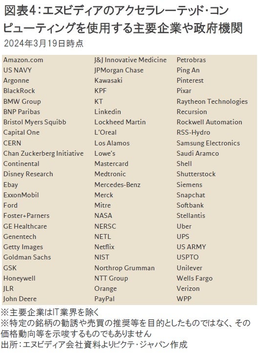 今回のGTCで特徴的なのは、IT業界以外の企業や政府機関がエヌビディア製品を使用していることが表明した点だ(図表4)。いま現在進行中の生成AIブームがIT業界だけにとどまらず、幅広い業種や政府機関を巻き込みながら「生成AI経済圏」が急拡大していることを印象づけた格好だ。