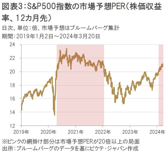 S&P500指数の足元の市場予想PER(株価収益率、12カ月先)はすでに21.1倍となっており、割高感は否めない(図表3)。