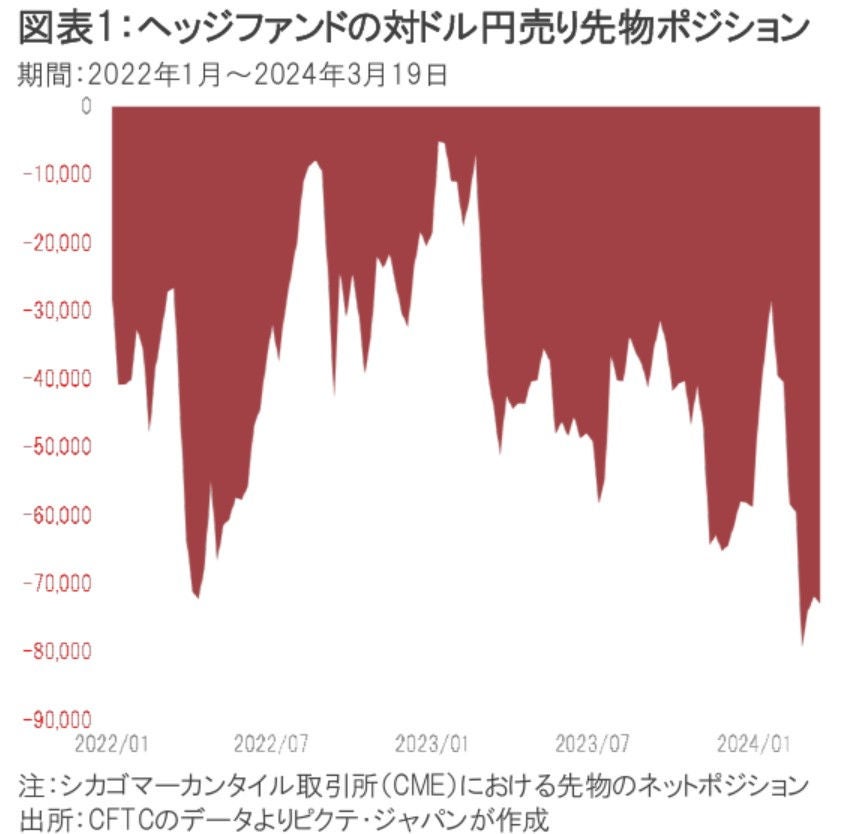 米国商品先物委員会(CFTC)によれば、シカゴマーカンタイル取引所(CME)でのヘッジファンドによる円/ドル先物取引のポジションが、足下、高水準の円売り越しになっている(図表1)。これは、日米両国の金利差に着目した円キャリートレードが継続するとの観測により、海外ファンドが一段の円安を想定していることを示すだろう。
