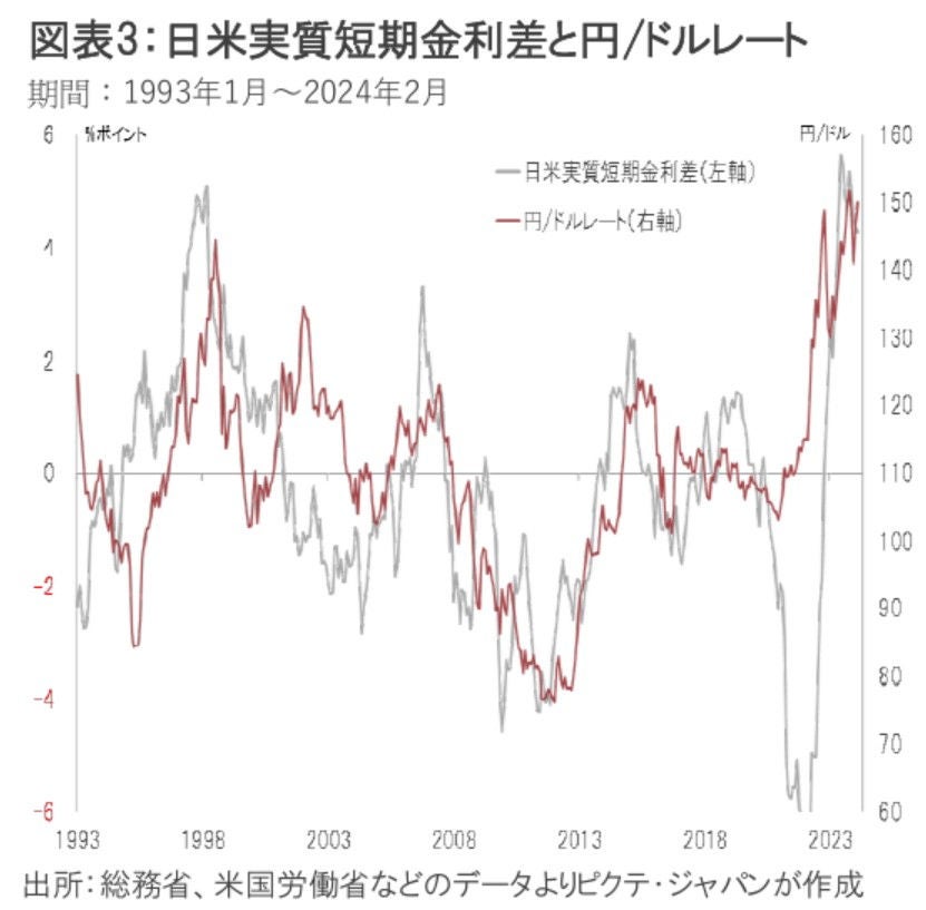 円/ドルレートは、中長期的には日米の実質短期金利差に強い影響を受けてきた(図表3)。足下、日米両国のインフレ率には大きな差はない。つまり、実質短期金利差と名目短期金利差は概ね一致している。日米の政策金利には依然として5%ポイント以上のギャップがあるため、円からドルへの資金の流れを抑制するのは難しいだろう。
