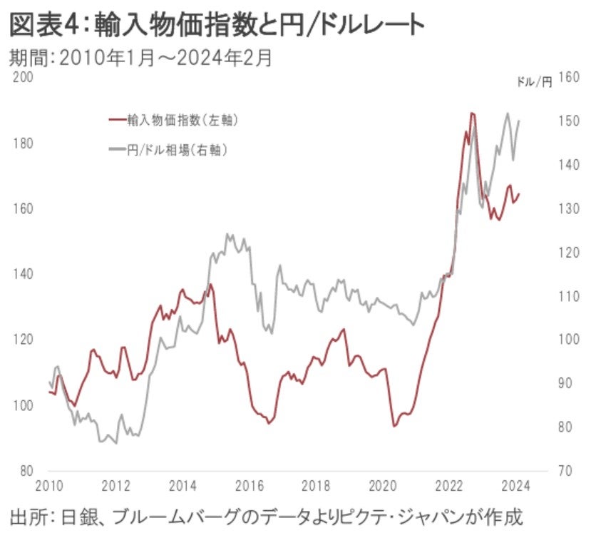 円安を放置すれば、輸入物価が押し上げられ、それはインフレ圧力となるだろう(図表4)。ただし、利上げは経済・市場への大きなリスクを伴う。また、介入を実施しても機能しなければ、円がさらに急落の可能性も否定できない。伝家の宝刀は、抜かないからこそ意味があるとも言えそうだ。