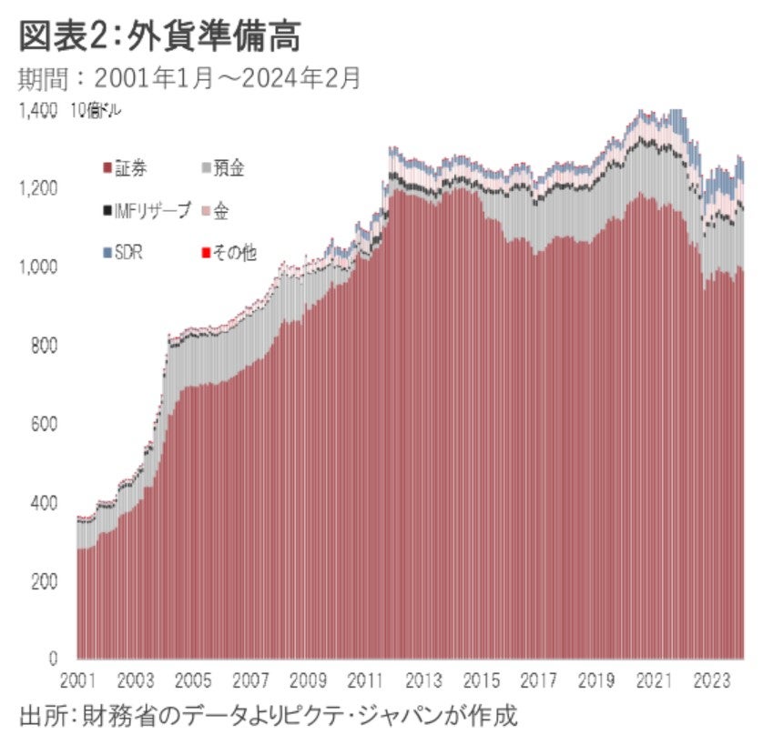 1つ目のハードルは、円買い・ドル売り介入がその上限が原則として保有する外貨準備高に限られることだ。2月末現在、日本の外貨準備高は1兆2,815億ドルだ(図表2)。大規模介入を行った2022年9、10月には975億ドル減少したが、これは当時の残高の7.5%に相当する。そうしたスケールで介入を続ければ、外貨準備が枯渇しかねず、さらに円売り圧力が高まるリスクがあろう。