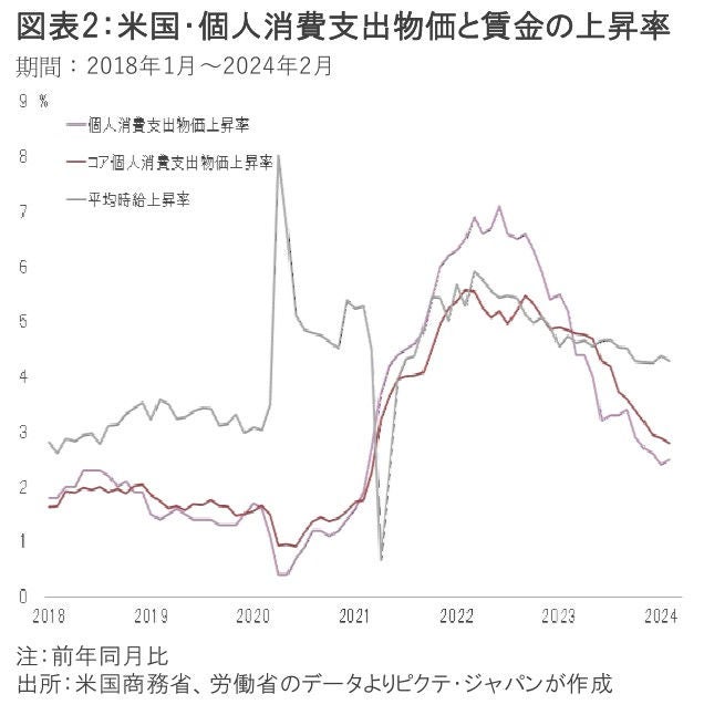 FRBが「長期的な目標」としている2%のインフレの尺度は、コア個人消費支出(PCE)物価である。2月の上昇率は前年同月比2.8%だ(図表2)。ターゲットには達していないものの、落ち着きつつある上、平均時給上昇率の4.3%を1.5%ポイント下回った。つまり、実質賃金の伸びはプラスに転じており、米国経済が健全な成長過程に回帰しつつある状況を示している。