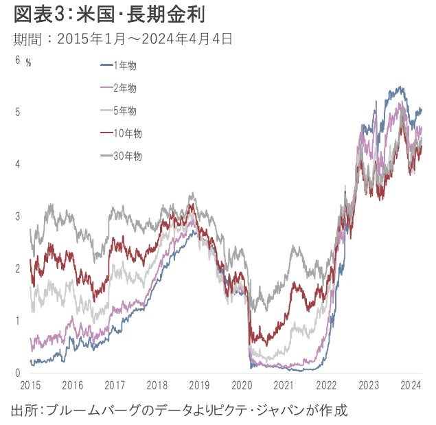 昨年暮れ、2024年末のリセッションを前提に、市場は年内7回程度の利下げを織り込んでいた。その結果、10年国債の利回りは、12月27日に3.795%へと低下している(図表3)。