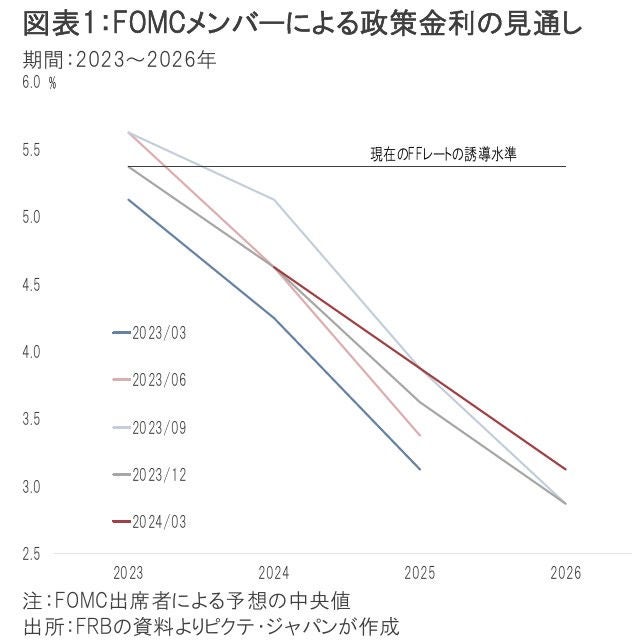 3月21、22日のFOMCに伴い、参加者19名の経済見通しが公表された。FFレートについては、2024年末時点での予想の中央値が4.50~4.75%であり、現水準から0.25%ポイントずつだと3回の利下げが見込まれている(図表1)。これは、昨年12月の前回経済見通しと同水準だ。