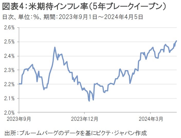 さらに、ダラス連銀のローガン総裁は4月5日、インフレの低下が失速し、タイムリーな形で2%へ鈍化しないかもしれないことに懸念を強めていると述べた。ボウマンFRB(米連邦準備制度理事会)理事も「政策金利を引き下げるのが適切な地点にはまだ至っていない。複数のインフレ上振れリスクが引き続き見られる」と同日に語った。FRB当局者も物価高への警戒感を高めているようだ。