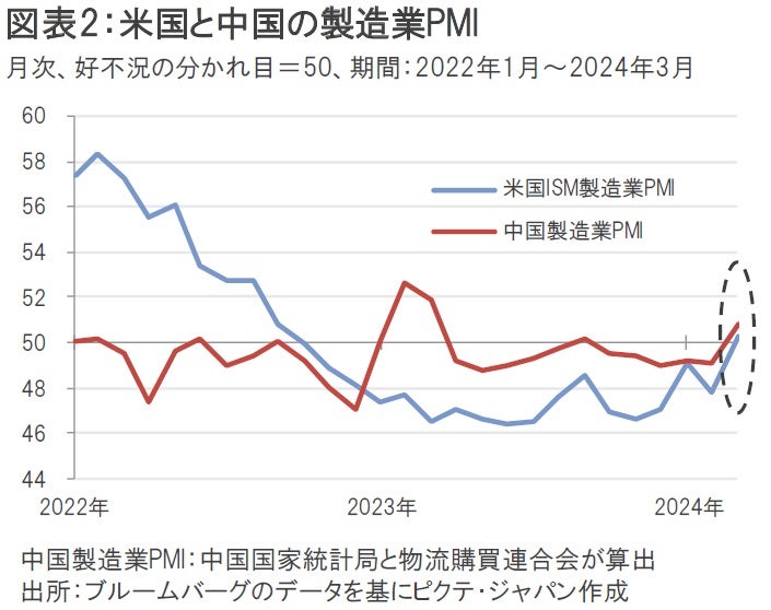 原油先物価格が上昇した背景としては、①米中景況感の改善観測、②OPECプラスの減産、③地政学リスクの上昇などが挙げられる。中国国家統計局と物流購買連合会が3月31日に発表した3月製造業PMI(購買担当者景気指数)は50.8となり、市場予想の50.1を上回ったほか、好不況の分かれ目である50を半年ぶりに上回った。また、米国では4月1日に発表された3月のISM製造業PMIが市場予想の48.3を上回る50.3となり、2022年9月以来の好況を示す内容となった(図表2)。