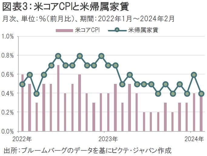 米国では物価高も意識されやすい状況となっている。食品・エネルギーを除いた米国のコアCPI(消費者物価指数)は今年1月に前月比+0.4%(市場予想は同+0.3%)、翌月2月には同+0.4%(市場予想は同+0.3%)と立て続けに市場予想を上回り、中でも帰属家賃の高止まり(1月:同+0.6%、2月:同+0.4%)が際立った(図表3)。