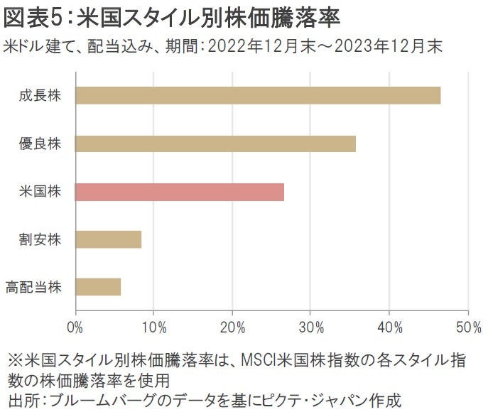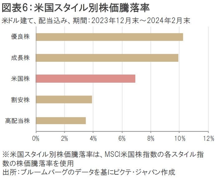 米国株式市場のスタイル別株価騰落率(米ドル建て、配当込み)を見ると、昨年末から今年2月末までは優良株や成長株が米国株全体のパフォーマンスを上回っていたことが分かる。これは2023年通年の状況とほぼ一致する動きだ(図表5、6)。