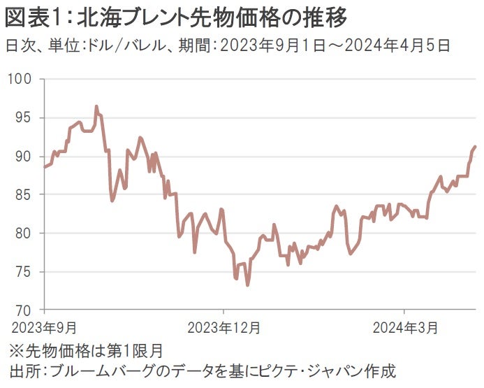 原油先物価格(北海ブレント、第1限月)は4月5日に終値で1バレル91.17ドルをつけ、昨年末時点の77.04ドルから18.3%上昇した(図表1)。