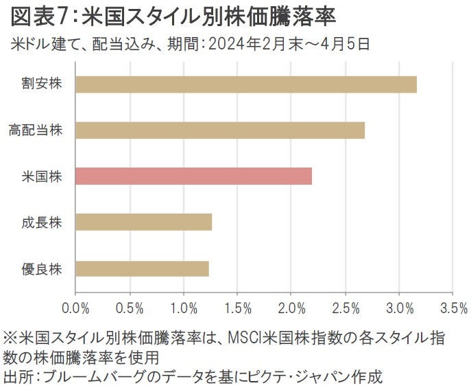 しかし、今年2月末以降のスタイル別株価騰落率を見ると、米国株全体のパフォーマンスを上回っているのは割安株と高配当株となっており、明らかにこれまでとは異なる値動きを示している(図表7)。