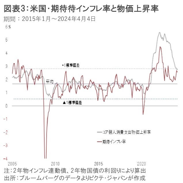 2年国債とインフレ連動債の利回りにより、市場が織り込む期待インフレ率を算出すると、足下、2.57%である。これは、FRBがターゲッティングするコア個人消費支出(PCE)物価の上昇率(2月:前年同月比2.8%)と概ね同水準だ(図表3)。