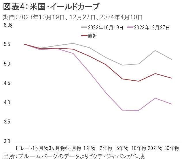 そうしたなか、米国の金利体系を見ると、イールドカーブは右肩下がり、即ち逆イールドだ(図表4)。この状態が定着したのは、FFレートの誘導水準が3.75~4.00%へ引き上げられた2022年11月1、2日のFOMCからだった。物価は大きく上昇していたものの、早晩、金融引き締めにより景気後退に至るとの見方がコンセンサスになったからだろう。